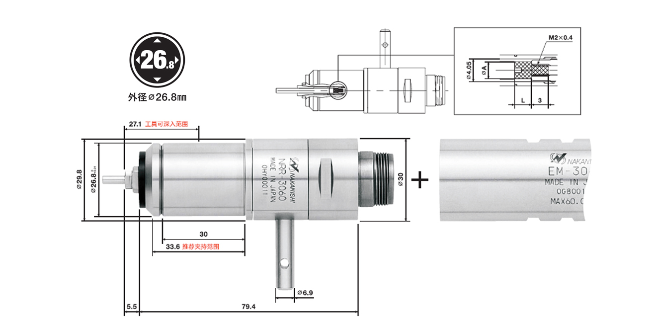 • 主軸外殼由精密研磨、硬化不銹鋼(SUS)制成,安裝外徑為φ26.8mm