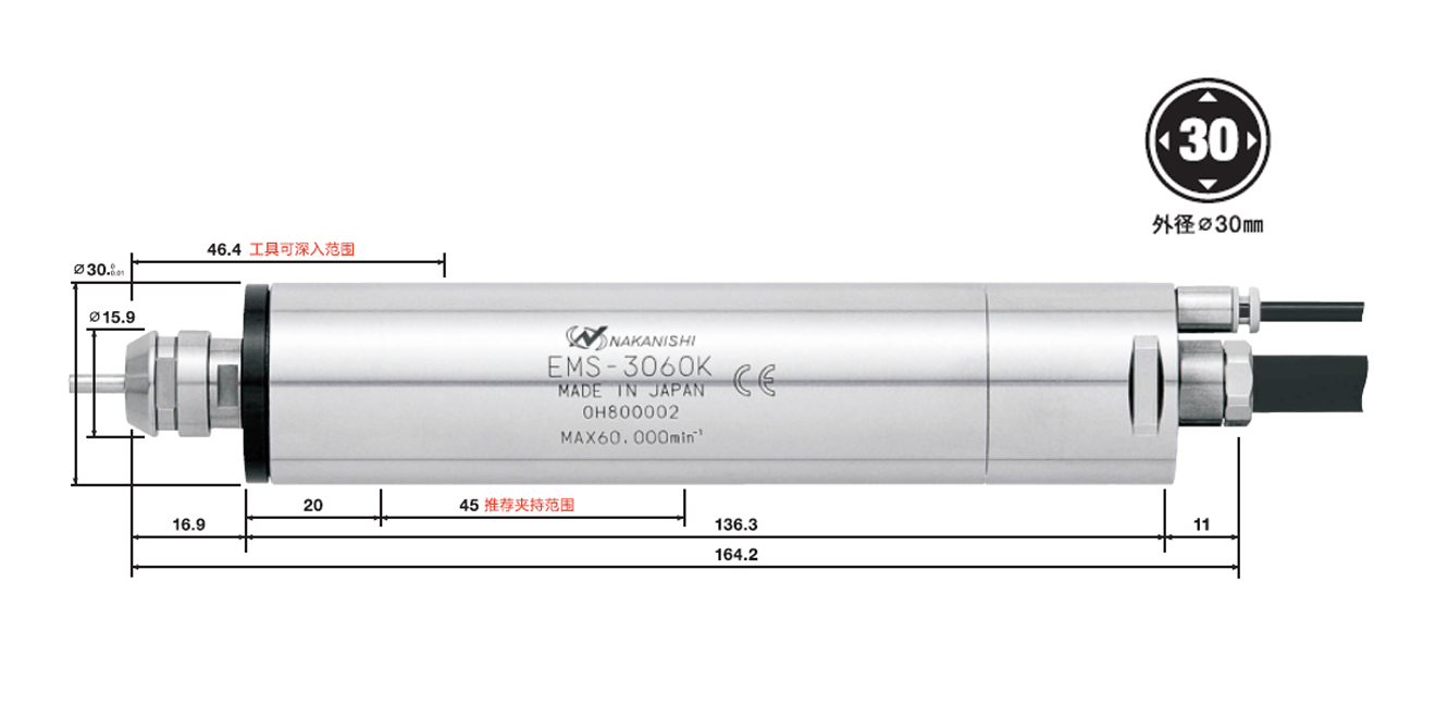 | EMS-3060K | 7862 | φ30 mm | 60000 min-1 | 1μm以內(nèi) | CHK系列(φ0.5~φ6.35mm) | 350W | 565g |