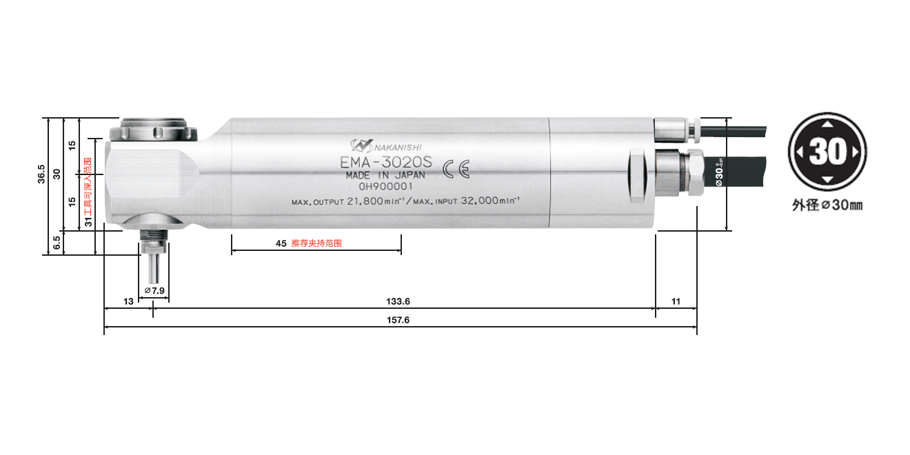 | EMA-3020S | 1758 | φ30 mm | 21300 min-1 | 1:1.5 | 32000 min-1 | 3μm以內(nèi) | CHSS系列(φ1.0~φ3.175mm) | 275W | 605g |
