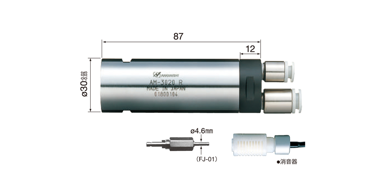 | AM-3020R | 1801 | φ30 mm | 19000min-1(0.5MPa) | 130W | 0.3~0.5MPa | 180 Nl/min | 298 g (不含軟管) |
