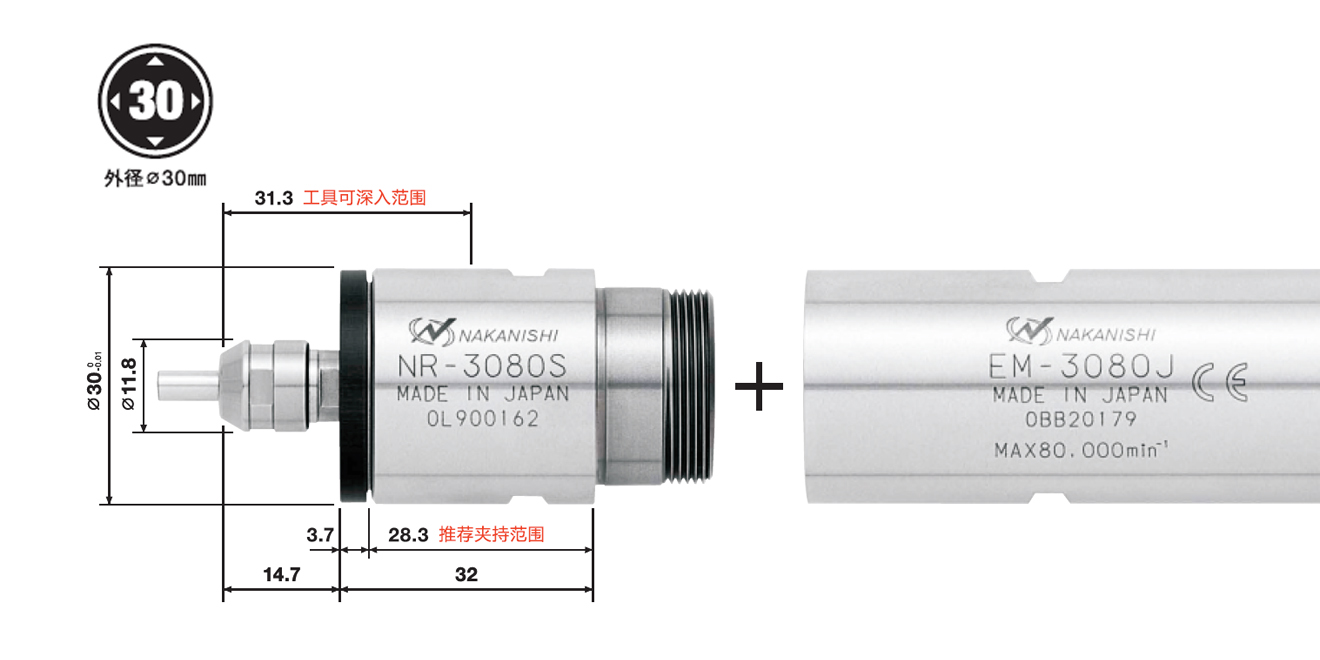 | NR-3080S | 7876 | φ30 mm | 80000 min-1 | 1μm以內(nèi) | CHA系列(φ0.5~φ4.0mm) | 170g |