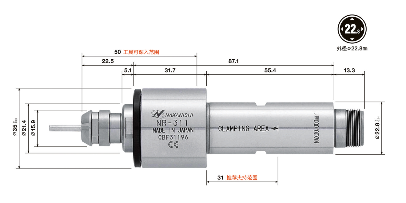 | NR-311 | 7832 | φ22.8 mm | 30000min-1 | 2μm以內(nèi) | CHK系列(φ0.5~φ6.35mm) | 370g |