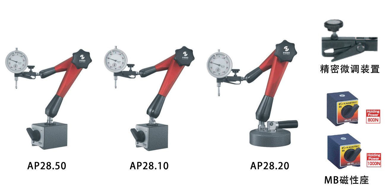 A-28P僅為萬向關節(jié)臂(P表示0.1mm級精密微調裝置);A-20P+M表示萬向關節(jié)臂帶燕尾槽量表架,M表示底座是開關磁力座。V指真空負壓基座