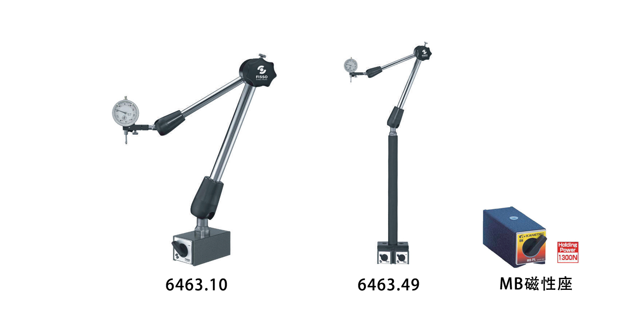 6400-63F僅為萬(wàn)向關(guān)節(jié)臂(F表示帶微調(diào)裝置);6400-63F+S+DMM表示萬(wàn)向關(guān)節(jié)臂配置DMM開(kāi)關(guān)磁力座(兩個(gè)MM磁力座并列),S為450mm的桿柱(Columm L,Order no.為5.469-1)