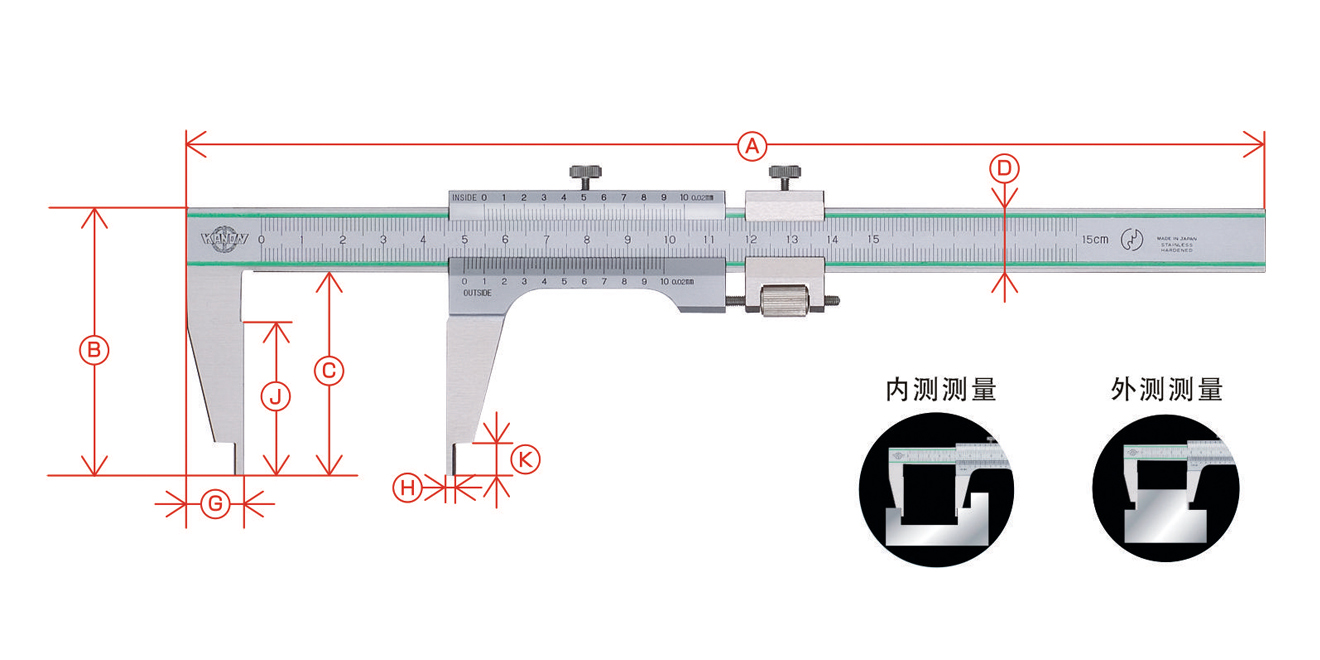 | 型號(hào) | 外側(cè)測(cè)定范圍 | 內(nèi)側(cè)測(cè)定范圍 | 最小讀值 | 誤差 | A | B | C | D | G | H | J | K |