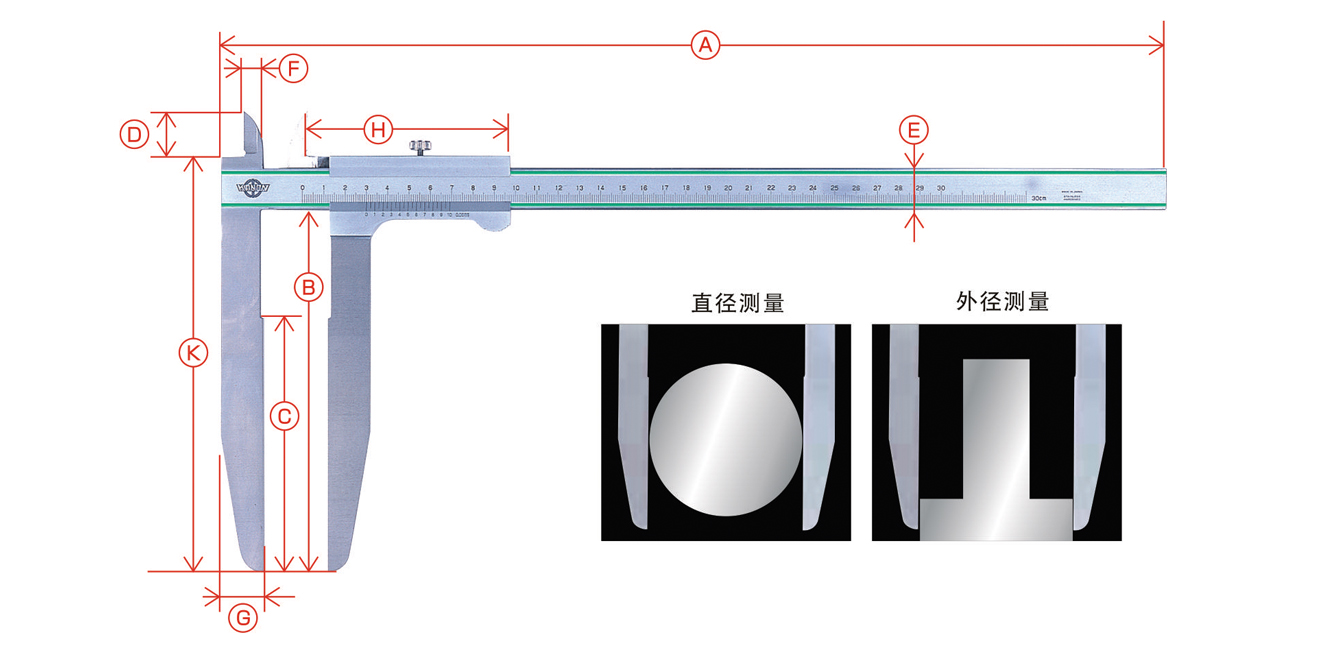 | 型號 | 測定范圍 | 下顎長度 | 最小讀值 | 誤差 | A | B | C | D | E | F | G | H | I | J | K |